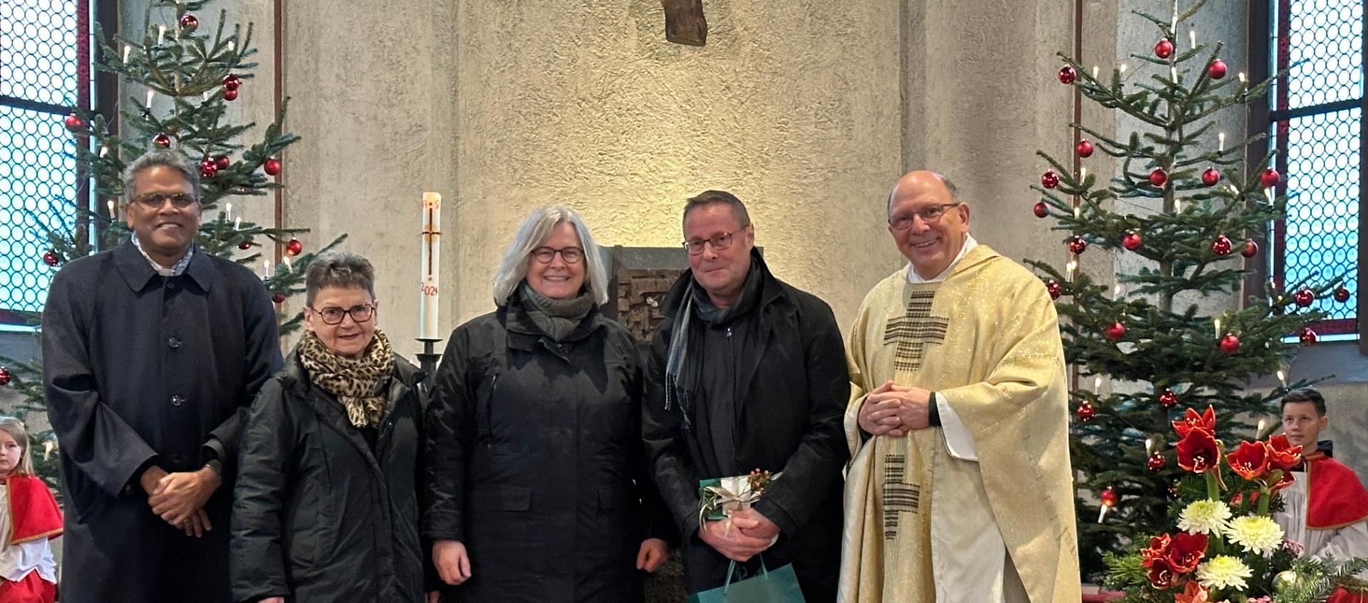 Mit einem feierlichen Gottesdienst wurde Regionalkantor Armin Press in der Stadtpfarrkirche Mariae Namen verabschiedet. Vor gut elf Jahren übernahm Armin Press, von Recklinghausen und Münster kommend, die Stelle des Kirchenmusikers in der Pfarrei Mariae Namen und in der Region Hanau. Dechant Andreas Weber dankte ihm für sein Engagement im Dekanat Hanau, insbesondere bei der Ausbildung des kirchenmusikalischen Nachwuchses im Unterricht für die Orgelschüler und Studierenden der Kirchenmusik. „In Erinnerung bleibt die Einführung der Lieder im damals neuen Gesangbuch „Gotteslob“. Bei der Neugründung der Pfarrei St. Klara und Franziskus und der Vorbereitung auf das Zusammenwachsen mit weiteren Pfarreien der Region haben Sie Ihre Erfahrungen aus früheren Dienstorten in der Pastoralen Dienstgemeinschaft eingebracht.“, so Dechant Weber. Er dankte Press für die Errichtung eines regelmäßigen „Kirchenmusik-Stammtisches“ für die nebenberuflichen Organisten und Chorleiter der Region und erinnerte an die Begleitung von Orgelbauprojekten, wie den Bau der neuen Weimbs-Orgel in der Kirche Heilig Geist in Hanau-Lamboy und die Organisation von regelmäßigen Orgelfeierstunden mit regionalen Organisten. Frau Ricarda Sommer-Charrier vom Verwaltungsrat, Pfarrer James und Pfarrer Manuel Stickel hoben sein Engagement für den Kirchenchor, die Frauenschola und den Kinderchor sowie die Gestaltung der monatlichen Fatima-Messe am Kirchort Mariae Namen hervor.